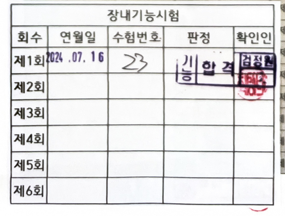 가장 어려운 굴절코스를 지나고 나니 더 긴장이 됐다. 그래도 침착히 S자 코스와 꼬깔콘을 지나 직선 코스까지 왔다. 처음에 속도를 내려했지만 좌우 균형이 안 잡히는 듯해서 그대로 직선코스를 올라갔다. 긴장이 돼서 조금은 좌우로 움직였지만 감점 없이 코스를 벗어나 시험에 통과했다. 나도 모르게 "어우" 하며 소리를 질렀다. 4번 만에 붙으니 기분이 너무 좋았다.