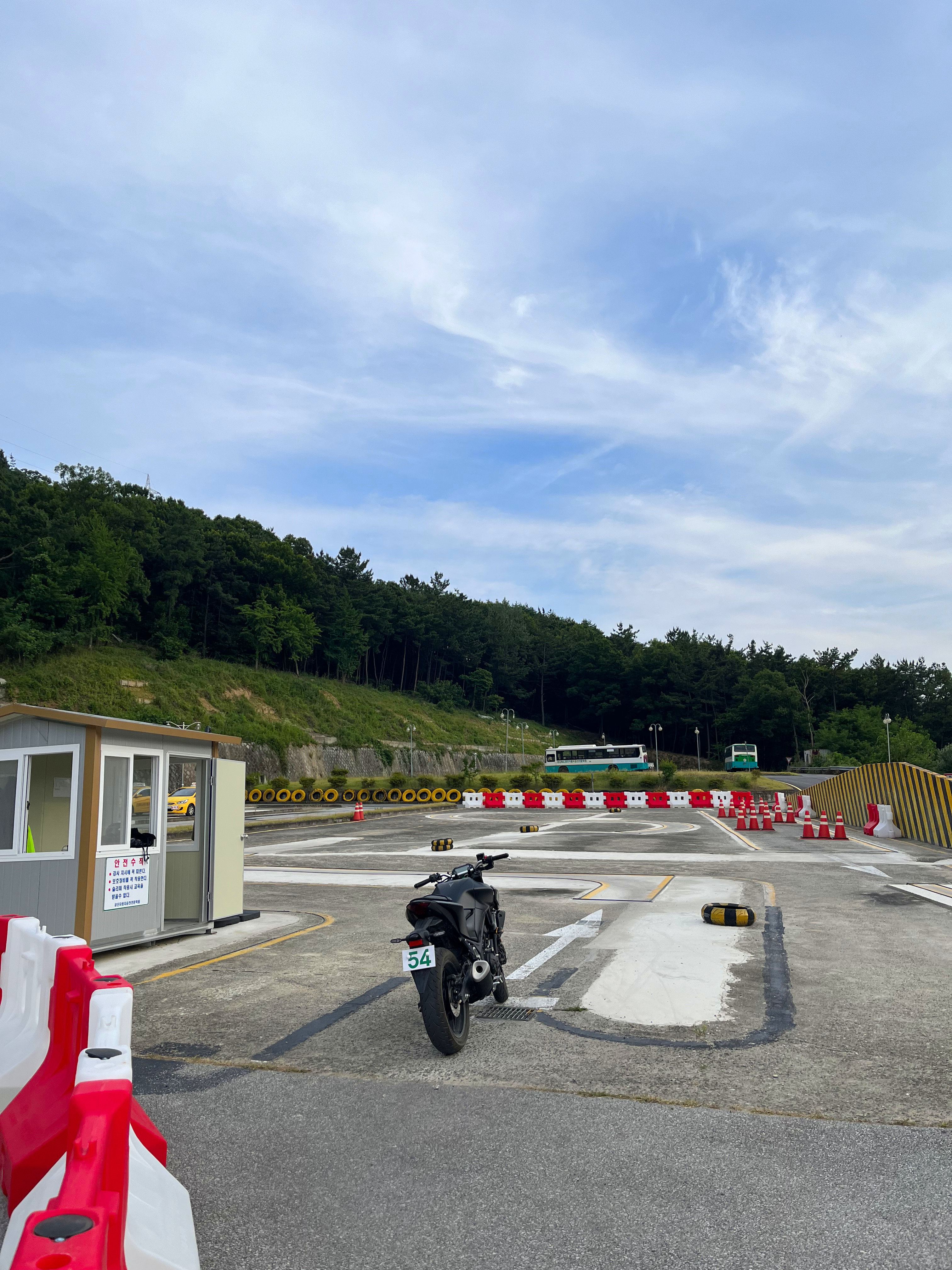 첫날이라 굴절코스, 직진코스를 제외하고는 재미있게 탔다. S자 코스와 꼬깔콘 코스는 너무 긴장해서 핸들을 훅 꺽지 않는 이상 감점하기는 어려워 보였다. 본격적으로 코스를 연습한다기보다는 클러치 조작과 같은 바이크에 적응하는 시간이었다.